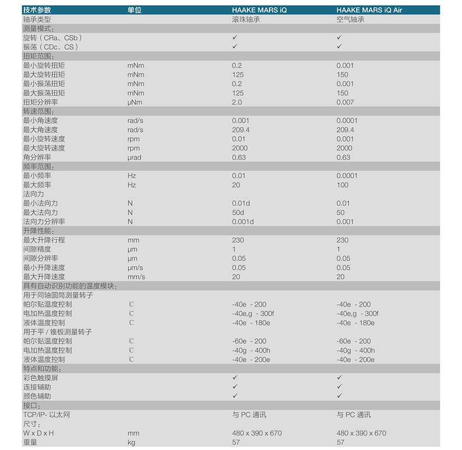 a 控制剪切速率,b 控制應力,c 控制變形,d 選項,e 取決于循環(huán)器的性能,f 當使用合適的測量轉子時,g 取決于冷卻方式,h 與樣品罩結合