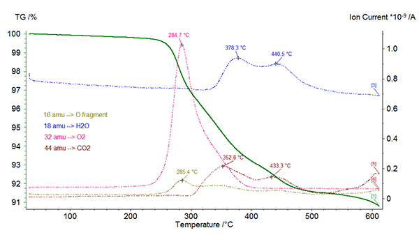在本例中,經(jīng)過脫鋰的鈷酸鋰材料從紐扣電池中取出,放入 NETZSCH STA449F1 Jupiter 與 QMS 403 Aeolos Quadro 聯(lián)用設(shè)備中進行分析。正極材料在升溫過程中顯示有幾個離散的分解臺階。在聯(lián)用質(zhì)譜的幫助下,可以很容易地理解材料的分解路徑,以及正極材料經(jīng)過循環(huán)后的深層結(jié)構(gòu)變化。