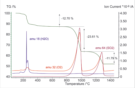29.53 mg 的 Nd2(SO4)3*5H2O 在氮氣氣氛、10 K/min 升溫速率下加熱至 1400°C。MID 曲線包括水、氧與二氧化硫三種氣態(tài)產(chǎn)物,與 TG 曲線上的相應(yīng)失重臺階對應(yīng)的很好。