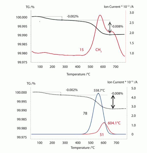 下圖實例使用綜合熱分析儀 STA449F1 Jupiter® 與四極質(zhì)譜儀 QMS 403 D Aëolos® 相聯(lián)用,對硅晶片上的微量有機污染物進行了鑒定。