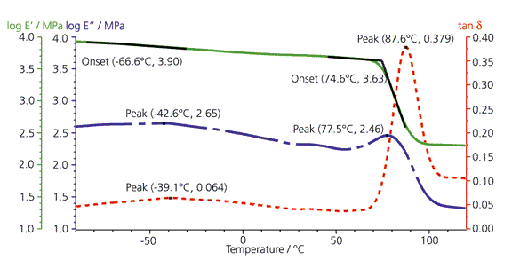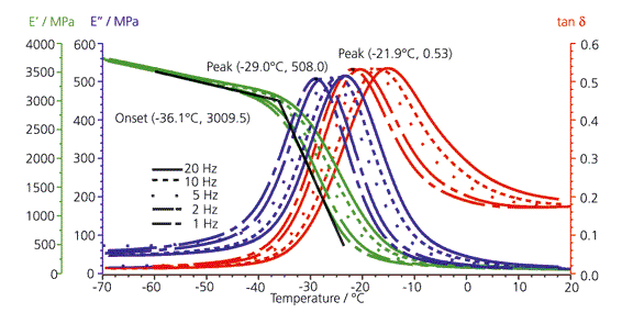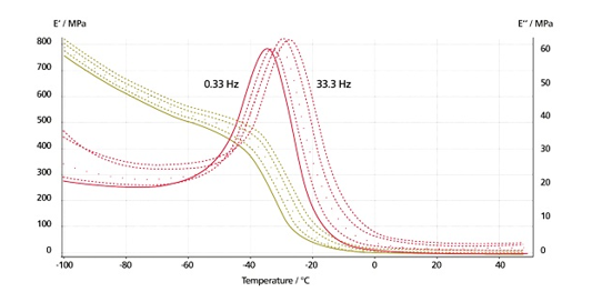 圖譜表明,這是一個典型的玻璃化轉變行為。儲能模量 E' 在 -40℃ 時迅速下降,E'' 則出現了一個明顯的峰。玻璃化轉變和振動頻率呈明顯的依賴關系:頻率越高,玻璃化轉變溫度越高。