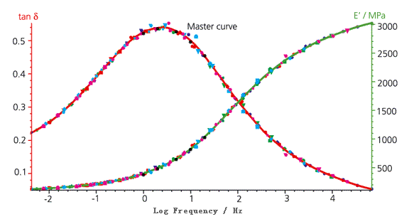 在多頻測試的基礎上,若使用 Williams-Landel-Ferry (WLF)方程以某參考溫度(圖中為 -20°C)為基準進行外推,可得到頻率外推曲線(主曲線,又稱為TTS曲線),推算常規測試所不能達到的極高與極低頻率下的 E’和 tanδ數值。