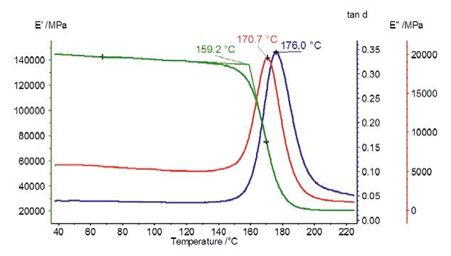 右圖所示為某一碳纖維增強環氧樹脂的 DMA 測試結果。圖中可見樣品在 50℃ 的儲能模量高達 145000Mpa,表明該材料的模量甚至比金屬鈦更高。由于環氧基材的玻璃化轉變,儲能模量曲線在 159℃(起始點)之后出現下降,相應的損耗模量峰值為 171℃,損耗因子峰值為 176℃。