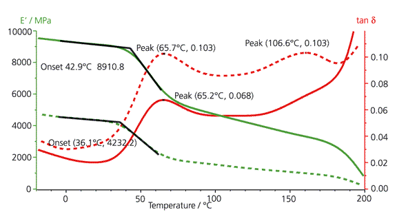 圖中對一種 30% 玻璃纖維增強的 PBT 材料分別取其平行與垂直于纖維方向進行 DMA 測試,使用三點彎曲模式、頻率 1Hz、升溫速率 2K/min。實驗結果表明平行方向(直線)的儲能模量明顯較高,E'下降起始點在 43°C,損耗因子數值也較小,兩者的損耗因子峰值則出現在同一溫度。