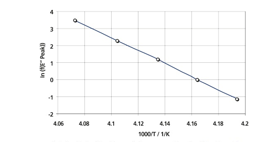 這些DMA 結果能夠用來幫助我們確定玻璃化轉變的活化能。可以發現 ln(f) 和 1/T 之間存在一個線性相關。通過這條直線的斜率,我們就可以計算轉變的表觀活化能了。計算得到的結果為 328 kJ/mol,在玻璃化轉變活化能的合理范圍內。