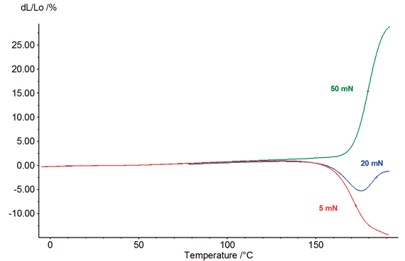 對薄膜施加作用力,測量其拉伸形變,收縮形變以及各向異性。此例中,在拉伸的模式下,我們測量了一個厚度為 40 μm 的聚碳酸酯薄膜的拉伸以及收縮的現象。由于作用力的不同,結果也差異甚大。施加作用力較小時(5mN),薄膜在高溫下收縮,而在施加較大作用力時(50mN),薄膜則發生膨脹形變。