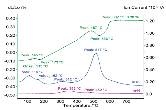 對于粘土和粉末樣品,通常使用的測試方法是TMA-MS(Aëolos®)聯用,溫度范圍是室溫至800°C。樣品最先釋放出吸附結合水和層間水(收縮0.01%);在300°C,有機組分開始燃燒(在 m18(H2O)與 m44(CO2)的曲線上出現峰),但是由于含量較少,對膨脹曲線并無明顯影響;在487°C到536°C間,粘土中的礦物成分脫水,圖譜中所對應的收縮為0.05%。