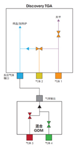 混合氣體輸送模塊(Blending GDM)可在Discovery TGA 5500 、TGA 550中靈活處理氣體。Blending GDM是帶有兩個氣體入口端口的外部附件,連接到TGA或SDT上的反應氣體端口后,用戶便可以控制四種氣體。這款軟件控制的附件支持在四個氣體端口之間自動切換并混合二元氣體混合物。這種新增的混合功能支持在氣體濃度比率固定、逐漸遞增或以受控速率勻速上升的氣體環境中進行TGA實驗。Blending GDM兼容氮氣、氙氣、氦氣、空氣、氧氣、二氧化碳、一氧化碳和混合氣體,可用于研究在受控氣體環境中,氣體在材料上的吸附能力、氧化還原反應以及材料的熱穩定性。